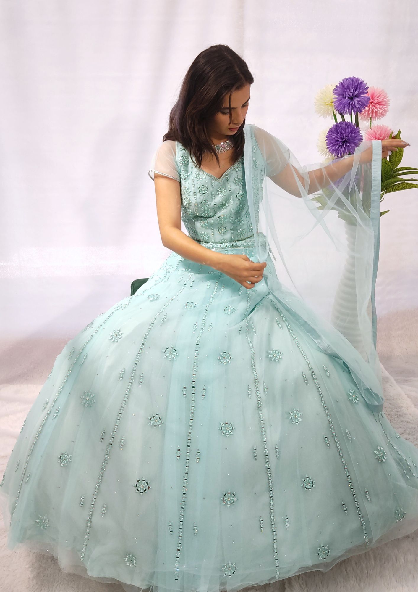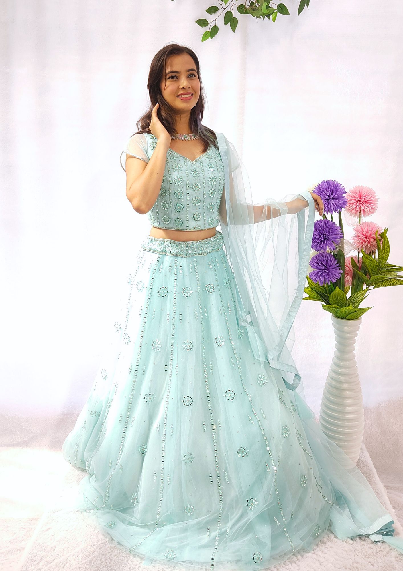 Mint Mirror Lehenga Dazzle at any special occasion with the stunning Mint Mirror Lehenga. Perfect for Diwali, weddings, and family functions, this crop top lehenga features intricate mirror work that adds a touch of elegance and sparkle. Ready to wear and designed for comfort, it is the perfect blend of tradition and style. Please note, jewelry is rented separately to complete the look. Book online now or contact us at 9322985234 for assistance. Actual color of the lehenga may vary slightly from the photos.