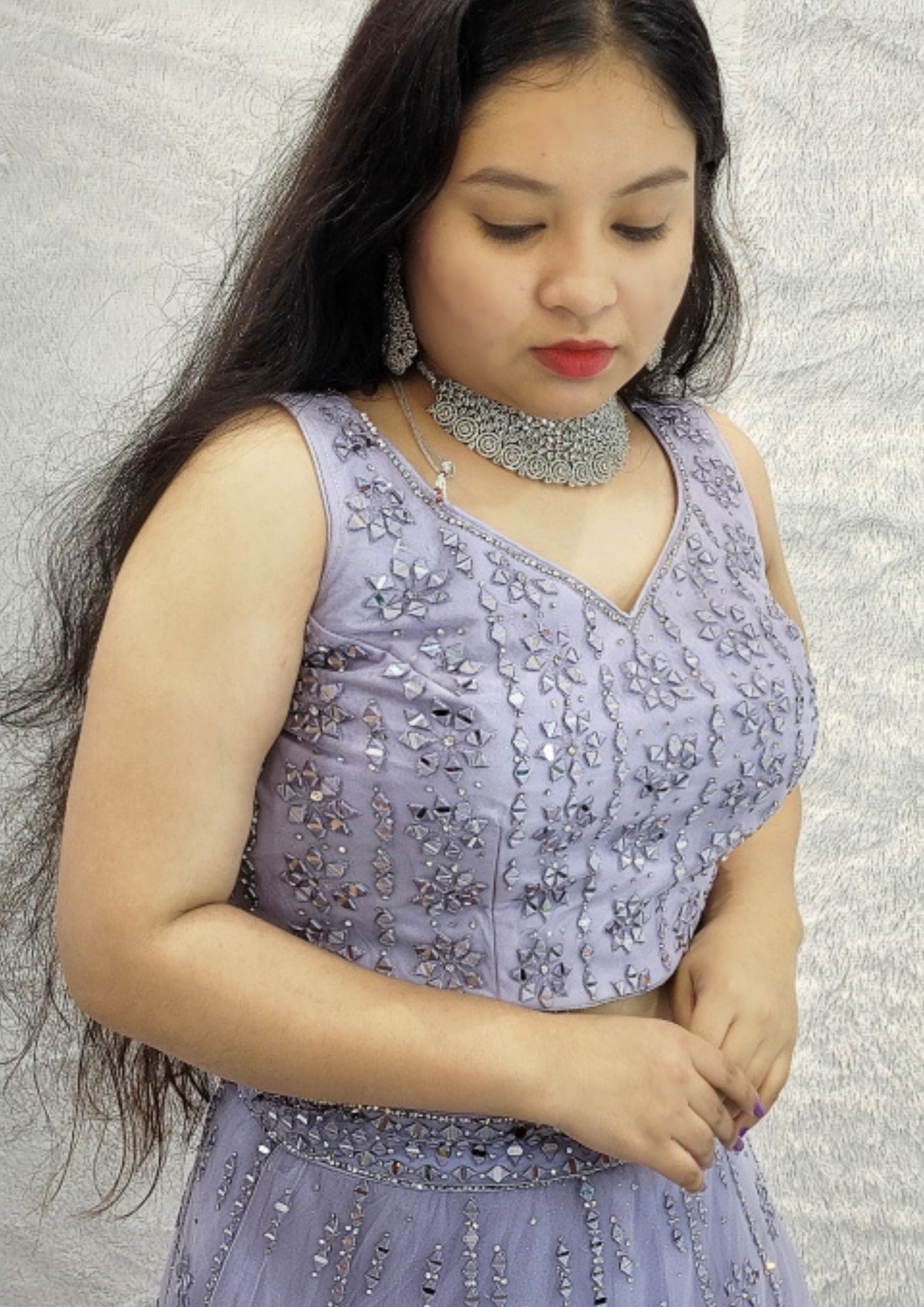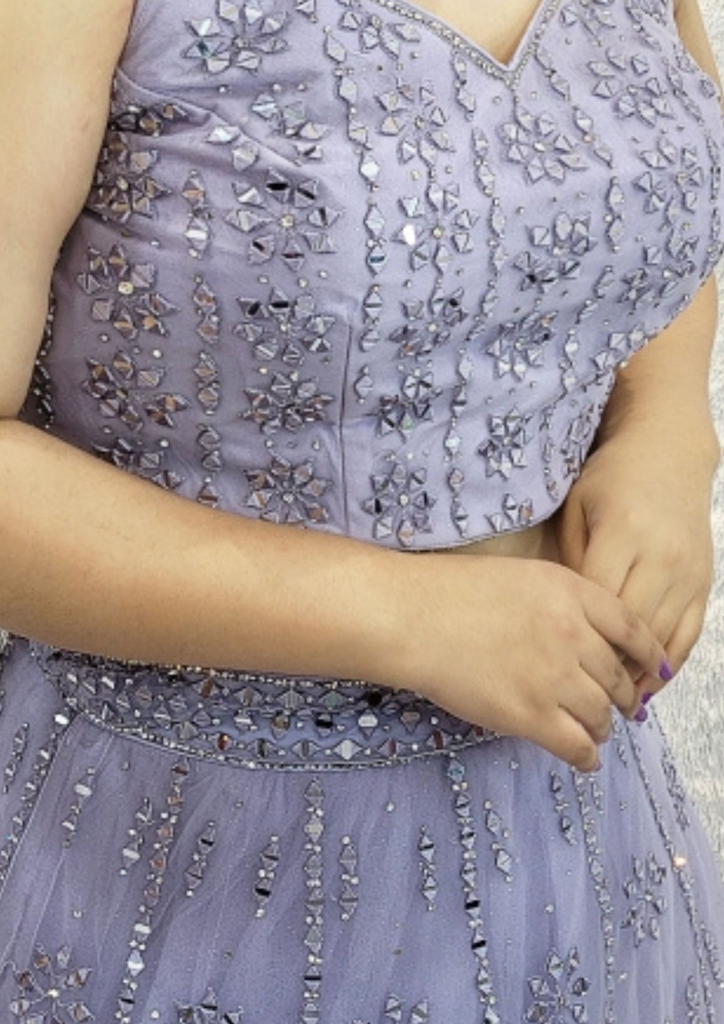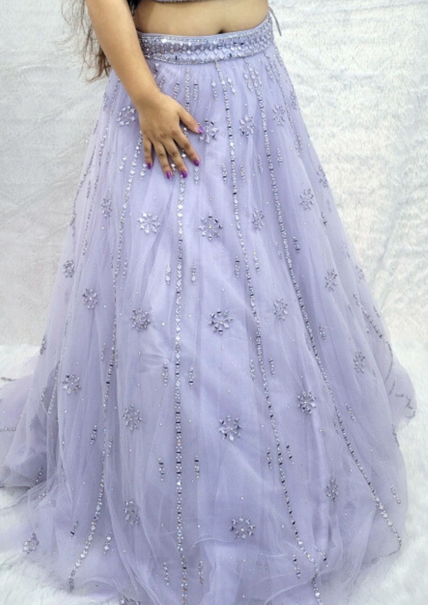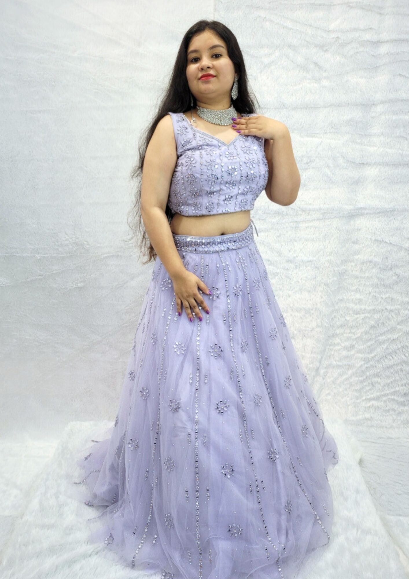Graceful Purple Lehenga Dazzle at any special occasion with our stunning Graceful Purple Lehenga. This ready-to-wear lehenga is embellished with shimmering mirror work, perfect for making an elegant statement as a side lehenga at a marriage ceremony or other festive events. Its intricate details and rich color make it an ideal choice for those seeking both grace and glamour. Please Note: Jewelry is rented separately to complete your look. You can easily book online or contact us at 9322985234 for assistance with your booking. Kindly note that the actual color of the lehenga may vary slightly from the photos.