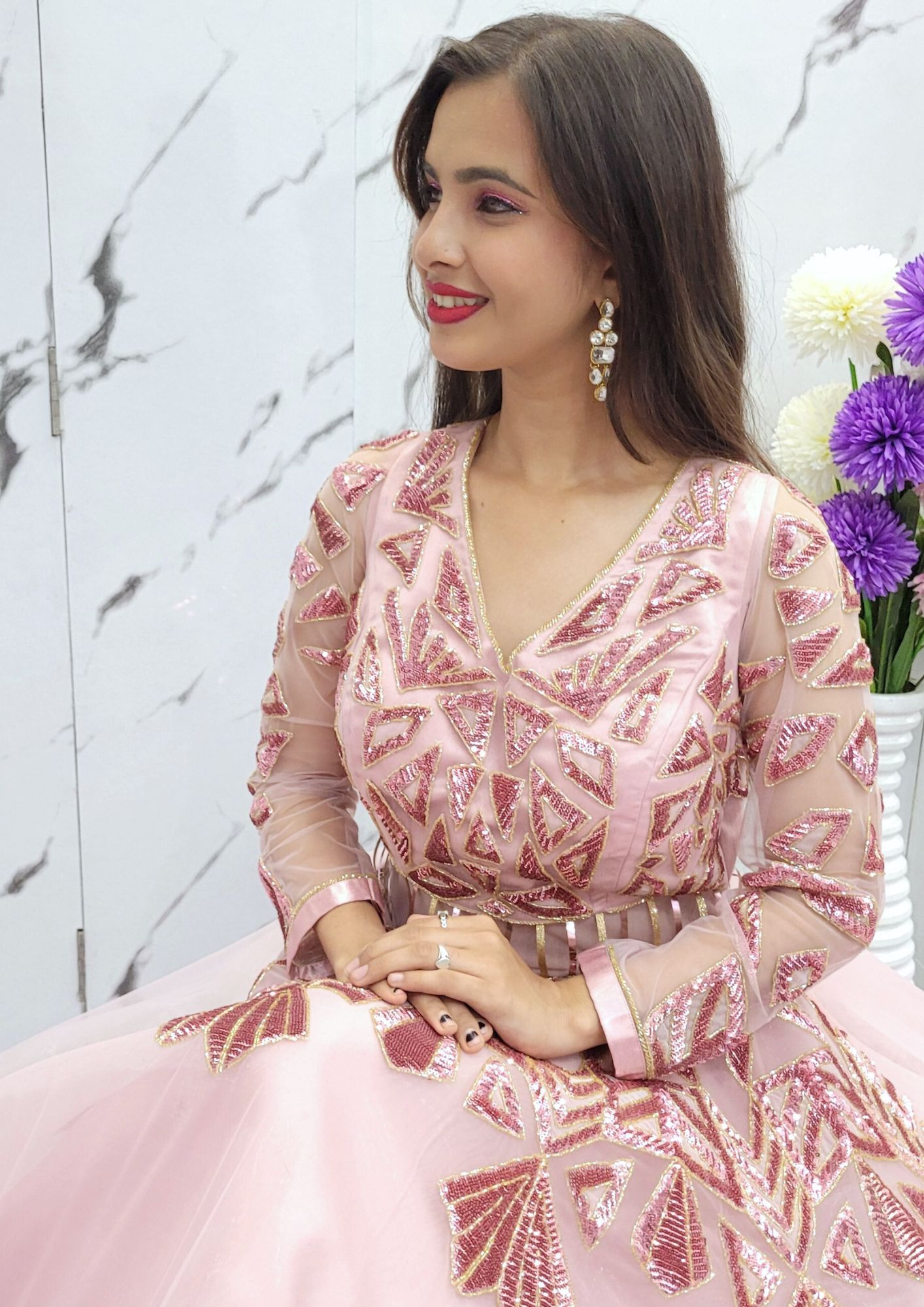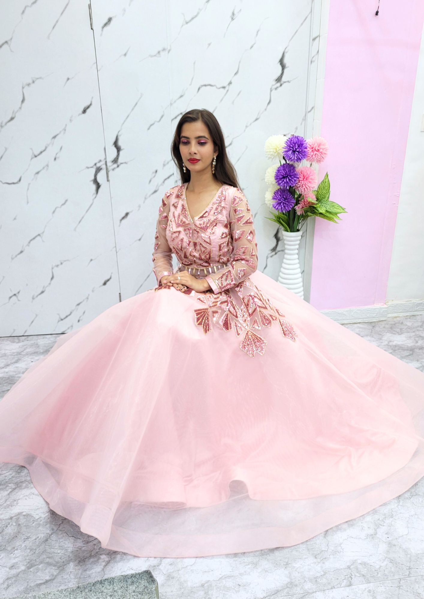 Glamorous Red Ball Gown Step into any celebration in style with the Glamorous Red Gown! Perfect for birthdays, receptions, or any special occasion, this stunning ball gown is adorned with exquisite sequin handwork and is as lightweight as it is eye-catching. Designed to make you feel effortlessly graceful, this ready-to-wear gown allows for easy movement, ensuring comfort throughout your event. Complete your look with jewelry available for rent separately. Book this must-have gown online today, or contact us at 9322985234 for a seamless booking experience. Note: The actual color of the gown may vary slightly from the photos.