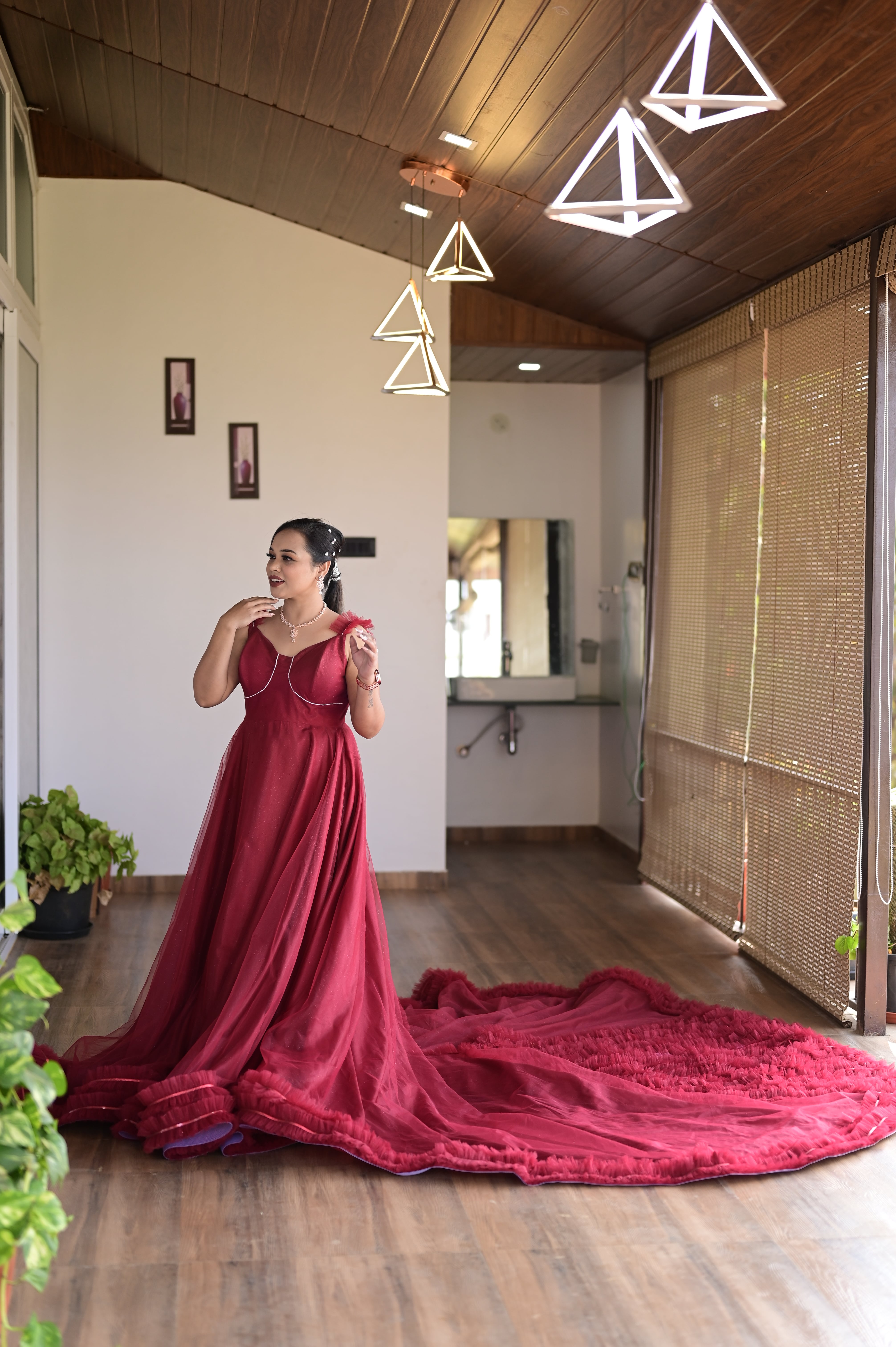 Luxurious Maroon Net Gown with Elegant Long Tail Make a grand entrance in this breathtaking maroon gown, made from exquisite net fabric that drapes beautifully for a dreamy, ethereal look. The deep maroon shade exudes timeless elegance, while the enchanting long tail adds an extra touch of drama and sophistication. Designed for those unforgettable moments, this gown offers a perfect blend of modern glamour and classic grace, ideal for weddings, red-carpet events, or any special occasion. Rent this gorgeous masterpiece from TREND ON RENT and elevate your style effortlessly!
