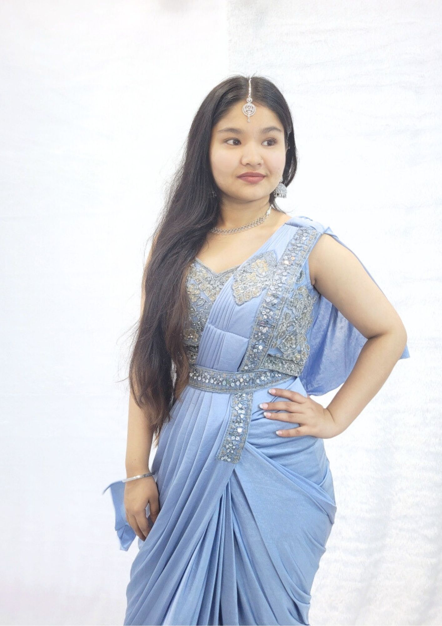 Enchanting Blue Saree (Ready to Wear) Turn heads at any special occasion, birthday party, or function with the Enchanting Blue Saree. This ready-to-wear saree is designed for easy draping and comfort, making it perfect for those looking for elegance without the hassle. The blouse features intricate, heavy work, adding a luxurious touch to the ensemble. Jewelry is available for rent separately to complete your look. How to Book: You can easily book this enchanting saree online, or if you need any assistance, feel free to contact us at 9322985234 and we'll be happy to help. Please note: The actual color of the saree may slightly differ from what is visible in the photos.